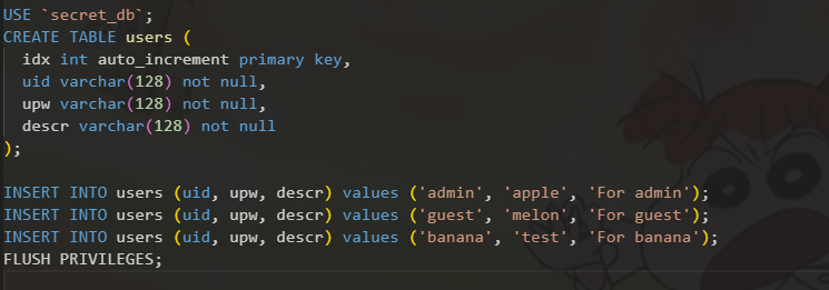 아까 user table을 봤을때 콜럼 4개에 순서는 idx, uid, upw, descr이라는 것도 알 수가 있었는데